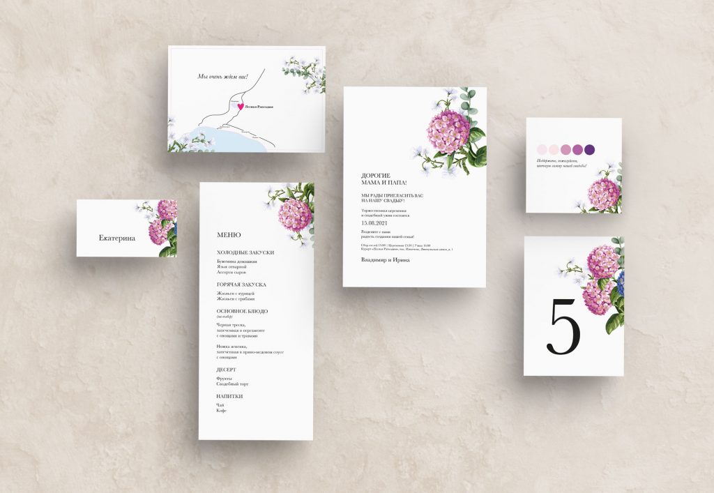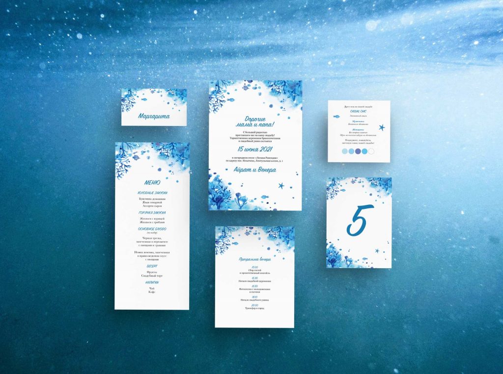 Готовые шаблоны свадебной полиграфии с акварельными иллюстрациями в морской тематике. В комплекте: Свадебное приглашение; Карточка рассадки; Номер…