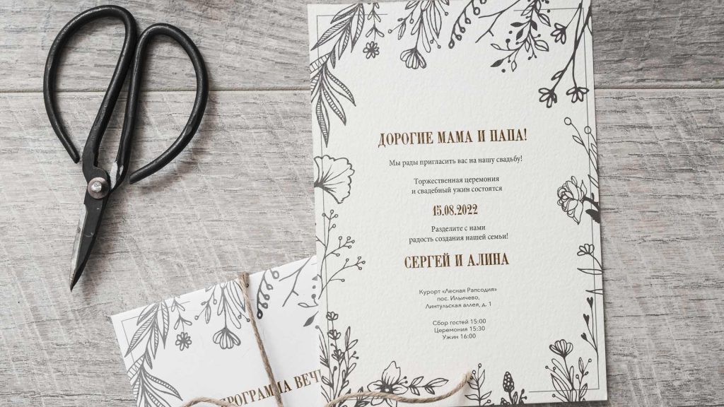 Шаблон свадебного приглашения в черно-белой гамме с лаконичной иллюстрацией. Скачайте шаблоны и редактируйте их. Шаблон скачивается в формате .PDF. Открыть…